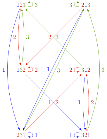 One can depict the action of the operators \(\partial_i\) on the state space \(\Omega_n\) by a digraph. The following picture shows the action of \(\partial_1, \partial_2, \partial_3\) on \(\Omega_3\):